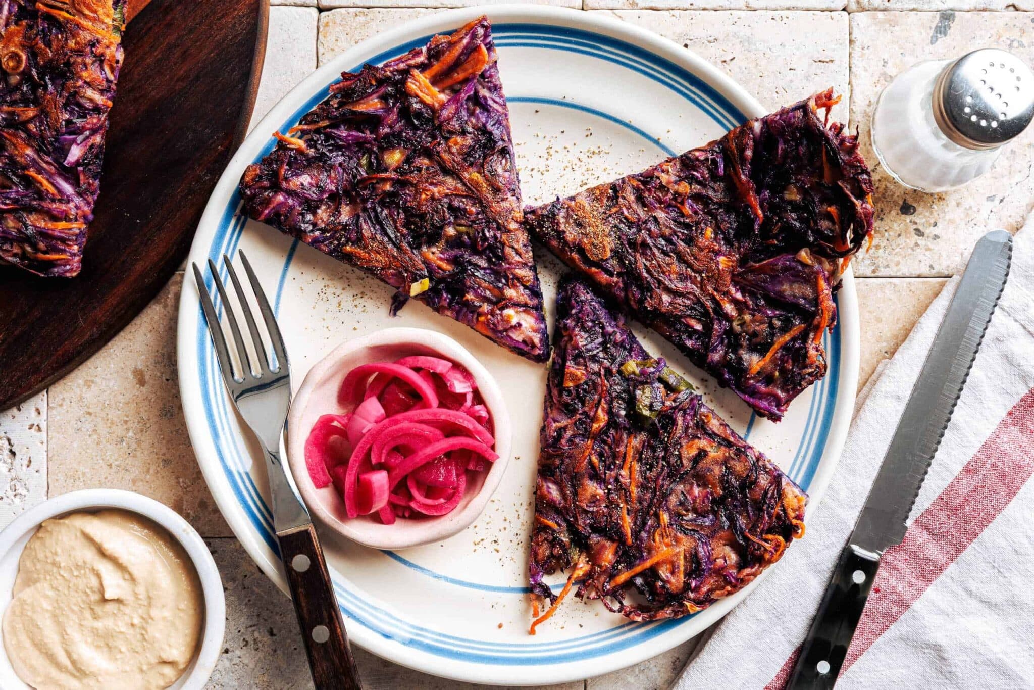 Le chou ne peut pas être seulement un plat d’accompagnement ! Nos crêpes au chou rouge sortent de la poêle légèrement croustillantes à l’extérieur et juteuses à l’intérieur, sont remplies de légumes d’hiver et, servies avec une trempette épicée au tofu miso, ont le goût d’une collation maison – mais en plus fraîches, plus colorées et plus saines.