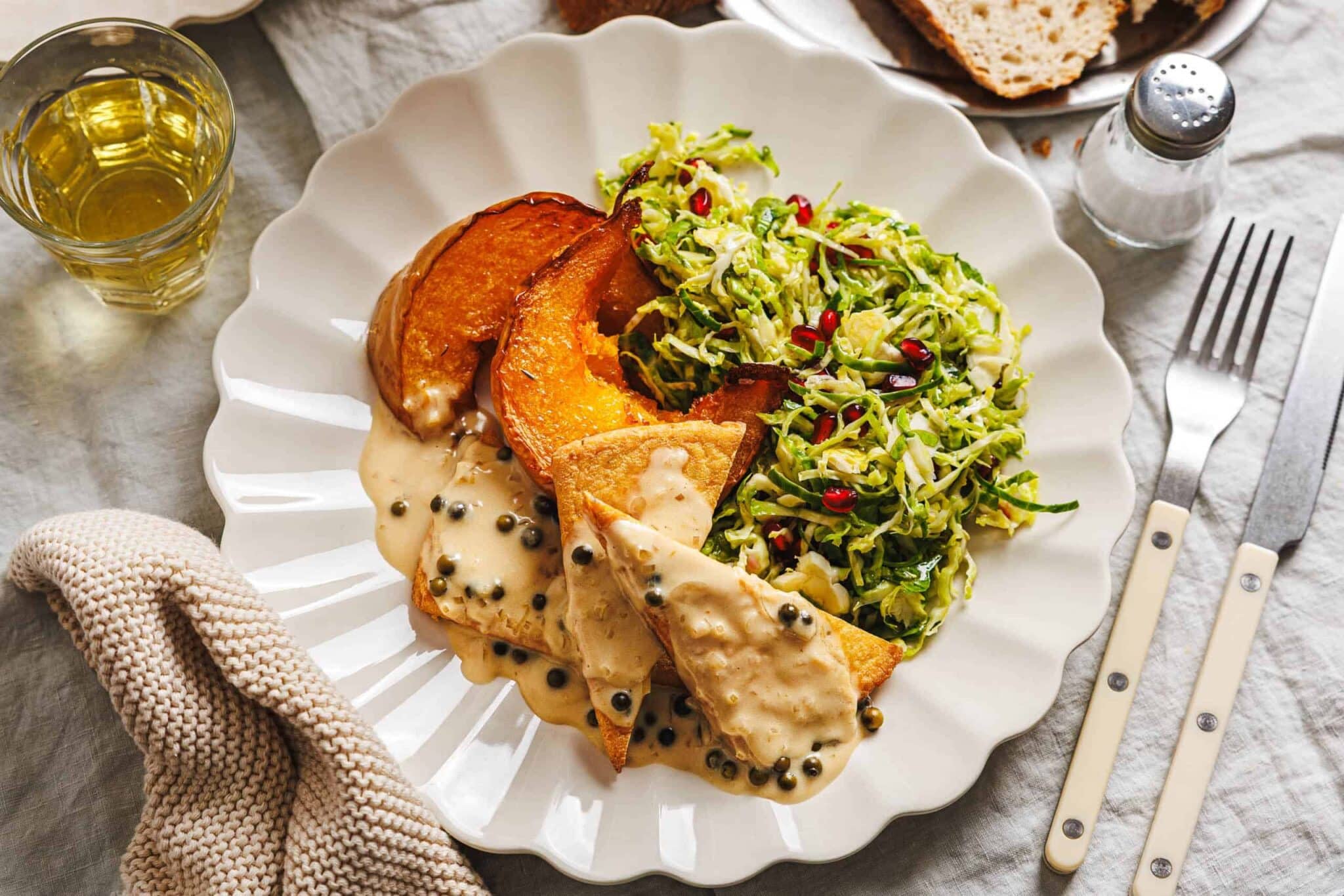 Les raviolis et les rôtis sont bien sûr un incontournable pendant la saison froide. Mais entre les deux, vous pouvez aussi organiser un festin qui n’appelle pas immédiatement à l’hibernation. Par exemple, des quartiers de citrouille cuits au four et des filets de tofu avec une sauce crémeuse au poivre vert et une salade de choux de Bruxelles frais.