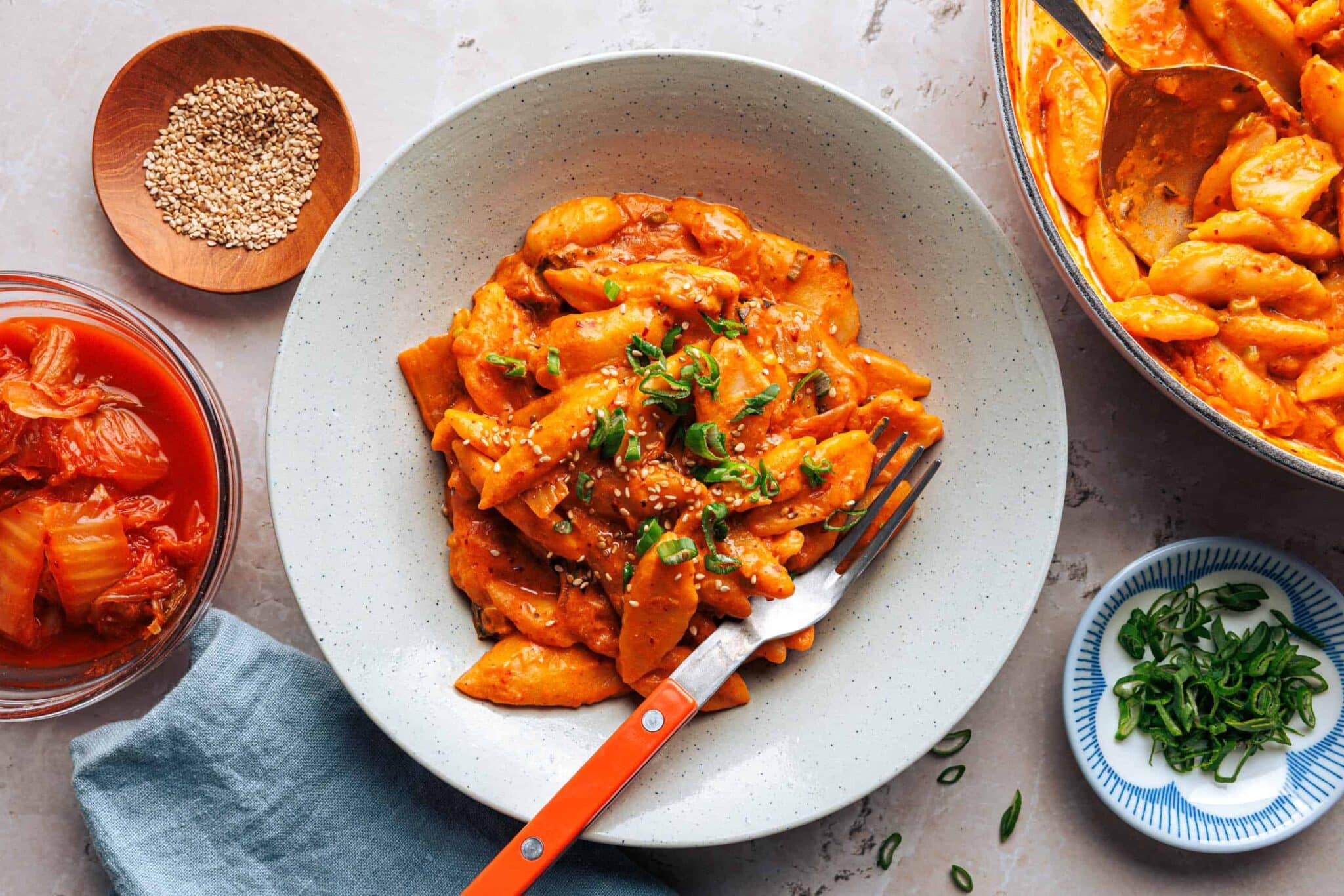 La partie blanche de l’oignon nouveau est sautée brièvement, puis un peu de concentré de tomate est ajouté pour la couleur et plus d’umami. Lorsqu’il est bien rouge brique, le kimchi est frit en remuant et déglacé avec de la crème d’avoine. Ensuite, la sauce est laissée mijoter doucement à feu doux jusqu’à ce que les nouilles aux ciseaux de tofu soient cuites. Le plus simple est de les sortir de l’eau de cuisson avec une écumoire et de les ajouter directement à la sauce. L’amidon présent dans l’eau de cuisson assure alors une bonne combinaison des pâtes et de la sauce.