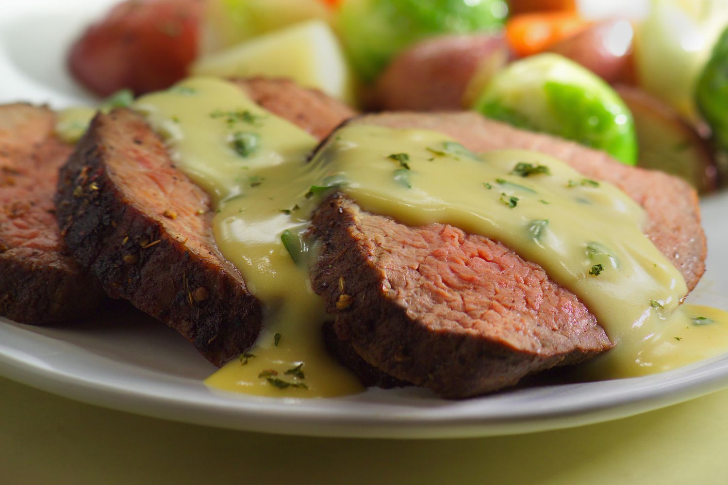 La sauce Bearnaise est une réduction du vinaigre et du vin mélangé avec des échalotes et de l’estragon puis épaissie de jaunes d’oeuf et de beurre. C’est absolument une sauce exquise qui est parfaite pour le steak, mais c’est aussi super avec le saumon, le poulet et les légumes. Il est considéré comme une sauce hollandaise «enfant» (l’une des cinq sauces mère française), sauf que le vinaigre et l’estragon remplacent le citron.