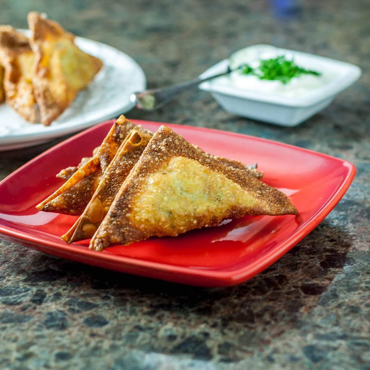 Samosas sont l’équivalent du latin Amérique empanadales seules différences étant que empanadaLes s ne sont généralement pas accompagnés d’une trempette, et ils sont en forme de demi-lune au lieu que les samoussas triangulaires ne sont pas vraiment difficiles à préparer. Comment faire des samosas qui ne prennent pas beaucoup de temps? Car ils sont un peu à forte intensité de main-d’œuvre. Utilisez des emballages Wonton Ready Made comme moi dans la recette ci-dessous. Vous pouvez faire un grand lot et geler, ce qui en vaut la peine. Enrôlez l’aide des membres de votre famille ou des amis aventureux et vous allez préparer un grand lot en un rien de temps!