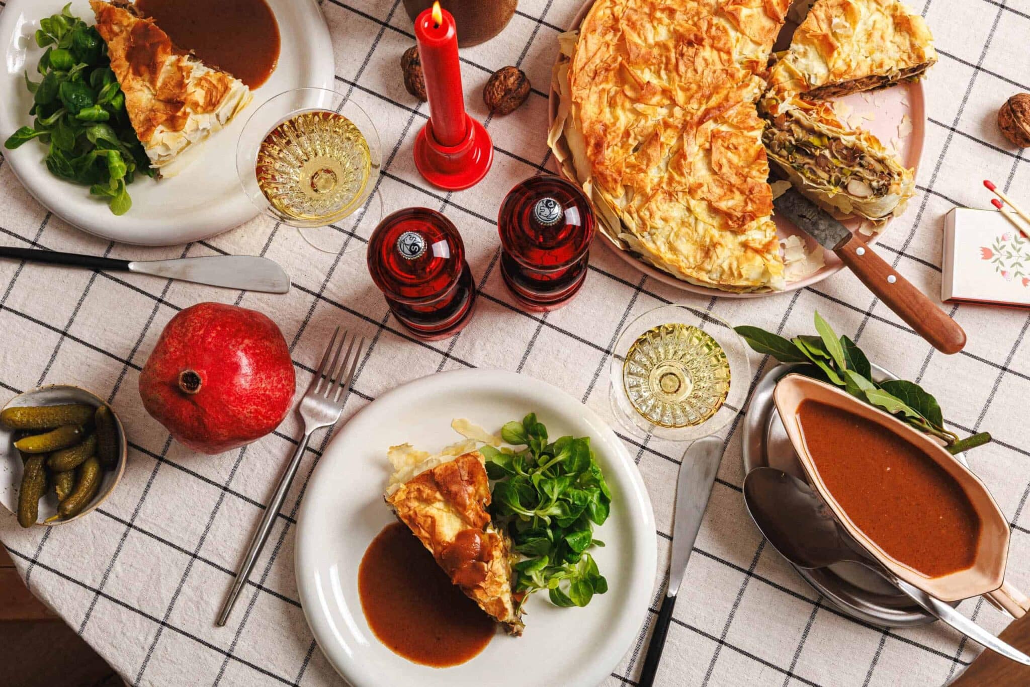 Tadaa, le voici, le plat principal de notre menu végétalien de Noël 2025 ! Nous avons opté pour un savoureux strudel aux champignons : une merveilleuse combinaison d’une coque super croustillante, de fines couches juteuses de pâte filo et de champignons, châtaignes et poireaux braisés, qui deviennent un véritable feu d’artifice de texture en bouche. Le seul feu d’artifice que je veux, d’ailleurs.